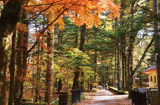 オーディトリアム通りから万平通り、幸福の谷へと、落葉をサクサク踏みしめながら森の小径を歩いて行く。頭上には、色づいたカエデやモミジ、コナラ、カツラなどが透過光で輝き、とても鮮やか。樹々の彩りと木洩れ陽、そして苔むした石垣が織りなす情景は、秋の旧軽井沢ならでは。