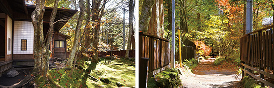 お気持ちの道から横道に入り木の塀の小径を進んでいくと、「ふるさとは遠きにありて思ふもの そして悲しくうたふもの」の詩句で知られる詩人[室生犀星旧居]の前に出る。昭和6年に建てられたという旧居は、障子、畳、縁側のある和建築で、苔むした庭にしっとりと佇んでいる。西洋建築様式の別荘が多い軽井沢ではむしろ新鮮。犀星は亡くなる前年の昭和36年まで毎夏をここで過ごし、堀辰雄、津村信夫、立原道造、川端康成、志賀直哉など多くの作家が訪れ交遊を深めたという。