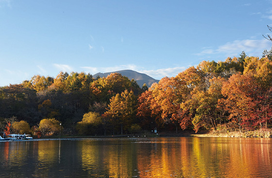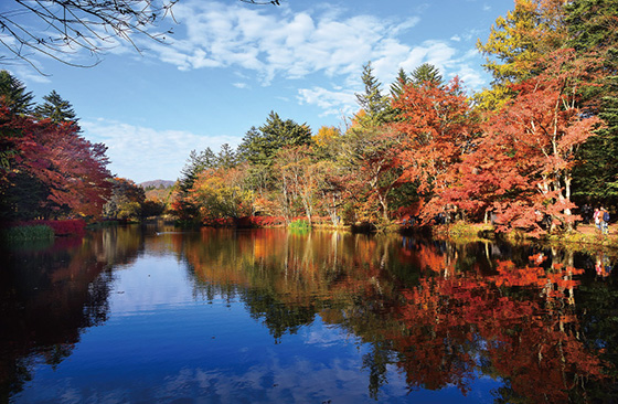 そして、軽井沢を代表する紅葉名所である雲場池へ向かうと湖畔のモミジが深紅に染まり、鏡のような湖面に映しだされた紅葉と青空のコントラストが実に鮮やか。雲場池の周囲には、この季節にしか撮れない絶景を写真に収めようと、一眼レフやスマホを手に夢中で撮影する観光客が訪れ途切れることがない。