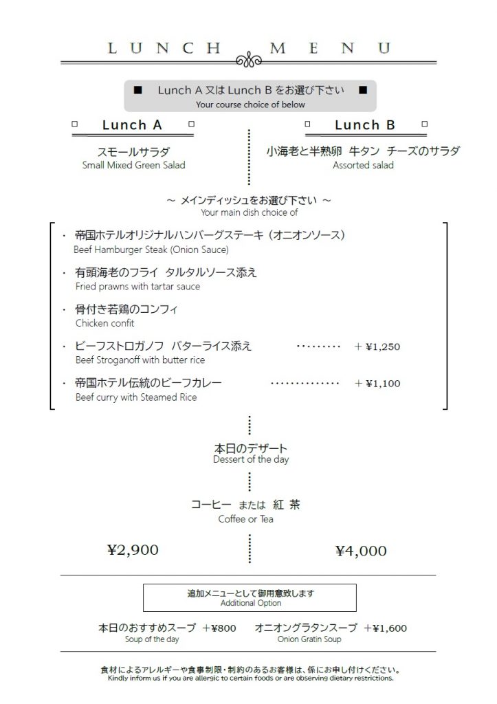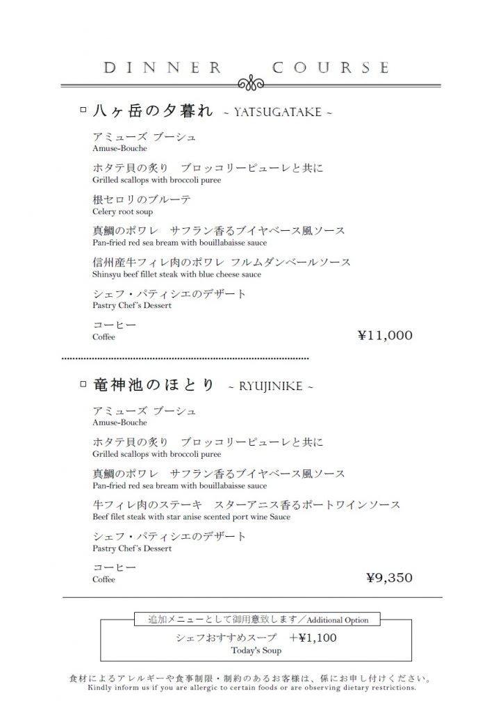 「レストラン竜神亭」ランチ・ディナーメニュー変更のお知らせ
