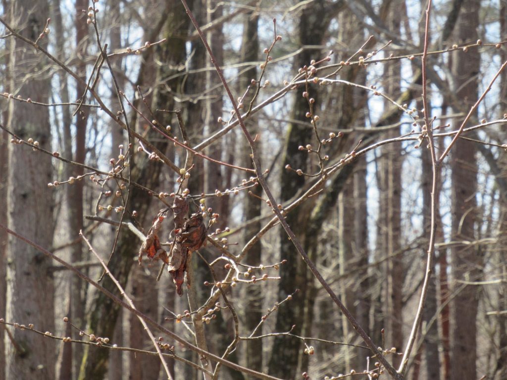 事務所裏手の窓から見える、か細いダンコウバイの枝のつぼみも