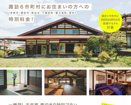 ちの観光まちづくり推進機構より、一棟貸し古民家のお得な宿泊プランのご案内です。 【ヤマウラステイ渋道】 長野県茅野市に位置する古民家一棟貸し宿泊施設「ヤマウラステイ渋道」では、 地域の皆様への感謝を込めて、下記期間に特別 […]