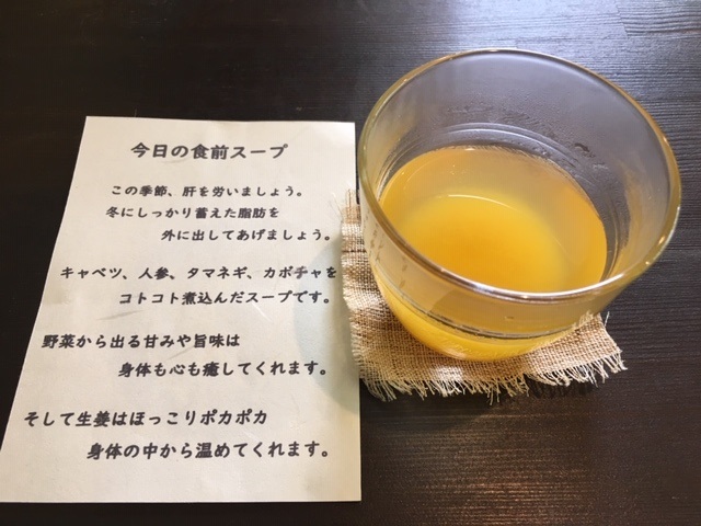 食前スープがいろいろ入っていて、とてもやさしい味がしました。