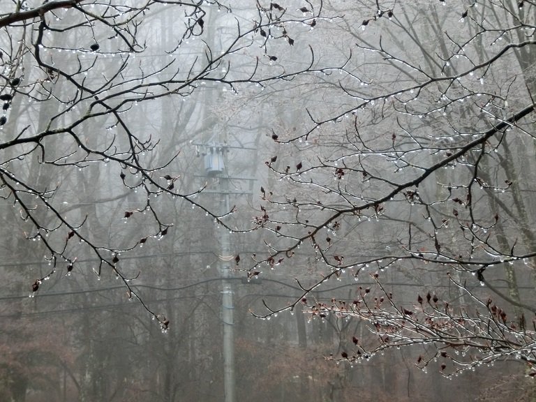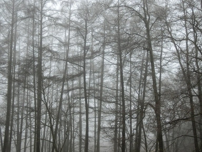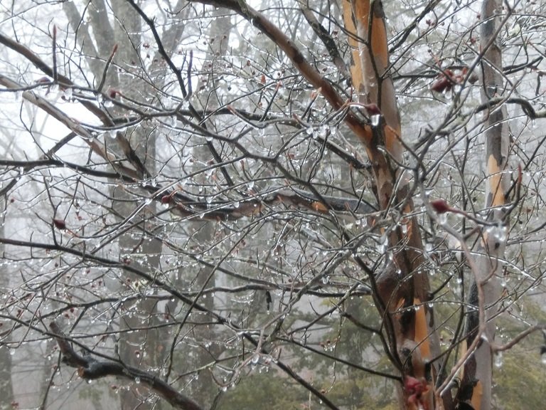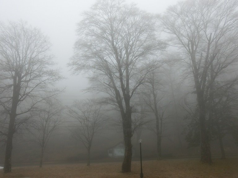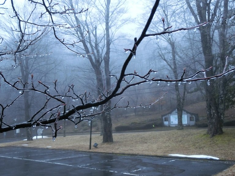 周辺は霧で覆われ、樹木は雨氷という現象で幻想的な雰囲気の
