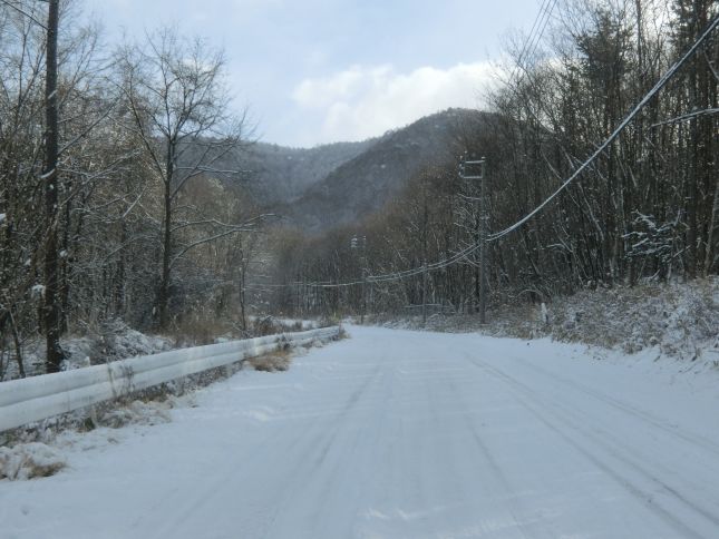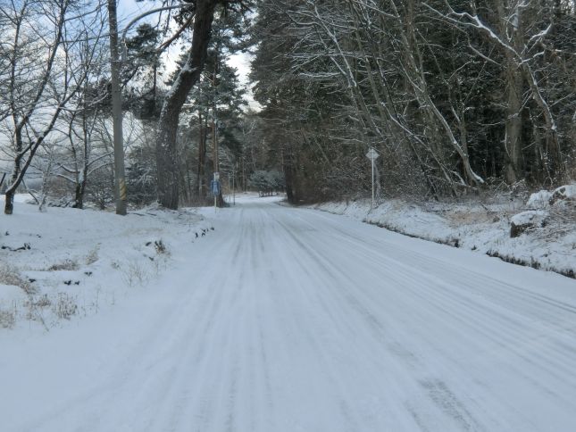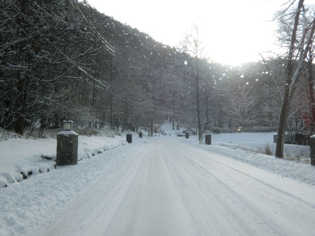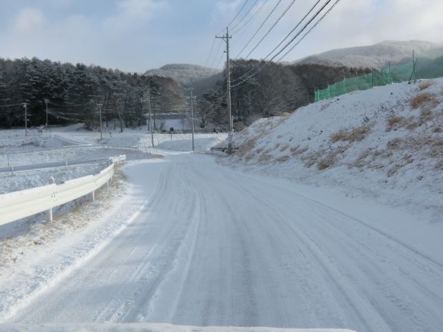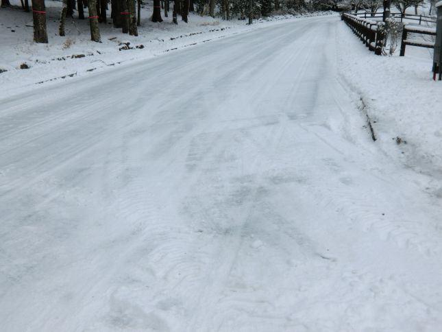 昨夜から降り積もった雪で道路一面が白くなりました。