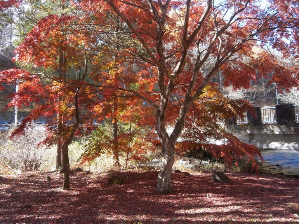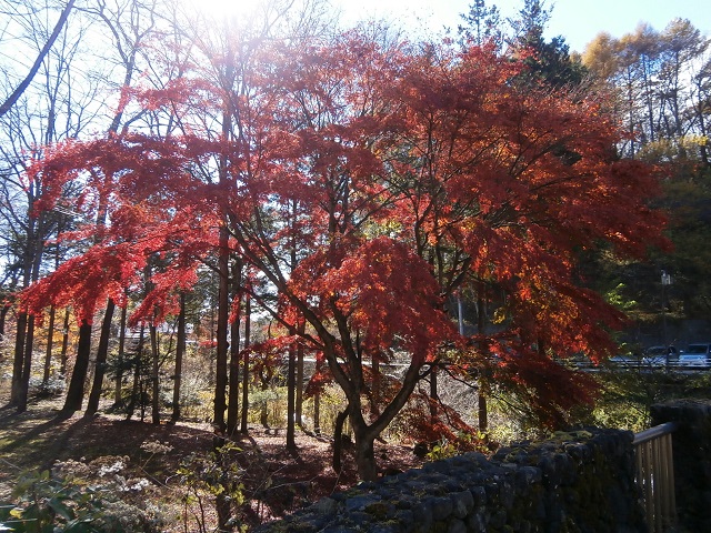 三井の森入口にあります、せきれい橋のそばの紅葉は現在ピークを迎え、陽だまりの中美しさを湛えています。