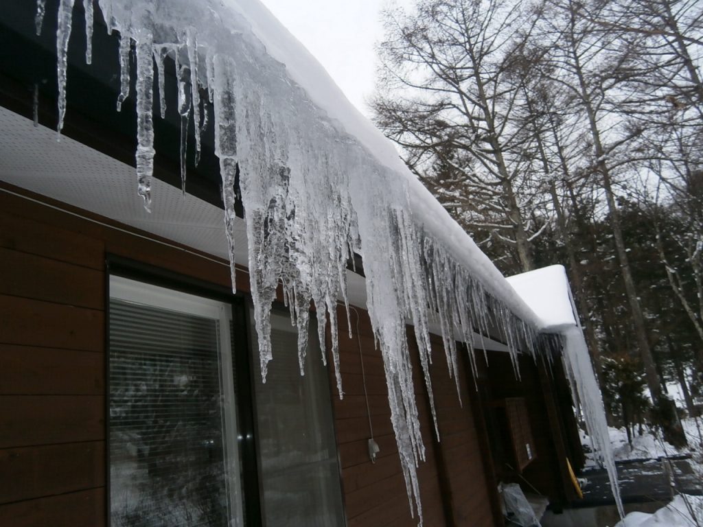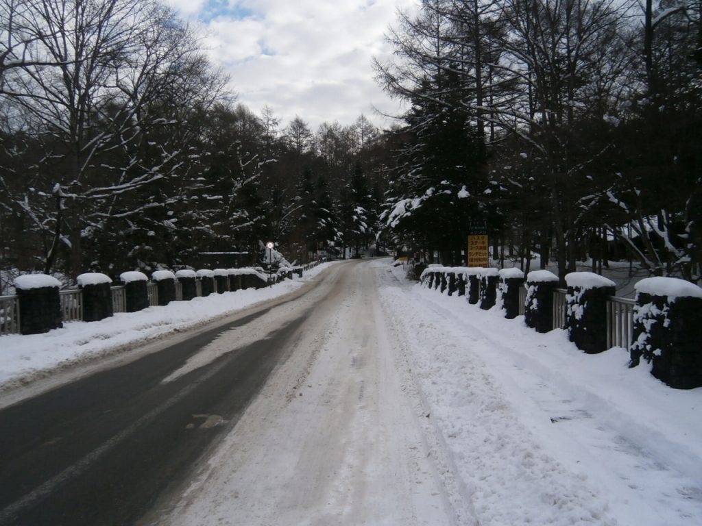 別荘地内の道路は除雪を行っていますが、寒さが厳しいためたいへん滑りやすくなっています。また敷地内は20~30cmほど積もっています。