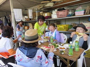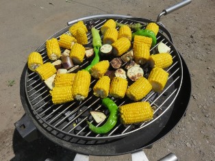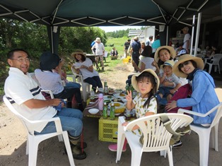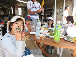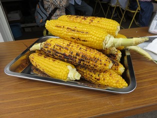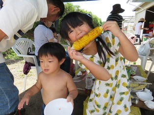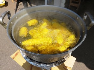 そして、恒例の当イベントお楽しみ企画第二弾!採れたてのとうもろこしの試食タイム!とうもろこしは、「ゴールドラッシュ」という品種で、柔らかく生でも食べられどれも実がぎっしり!大きな寸胴鍋で茹で、炭火で焼きました。