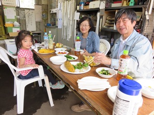 他にもイマイ農園の獲れたて野菜(万願寺とうがらし、ナス)を炭火で焼いて試食。