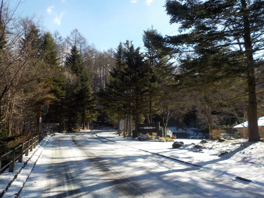 道路にはほぼ雪はありませんが、別荘地の中の日陰には雪が残り、凍っている状況ですので