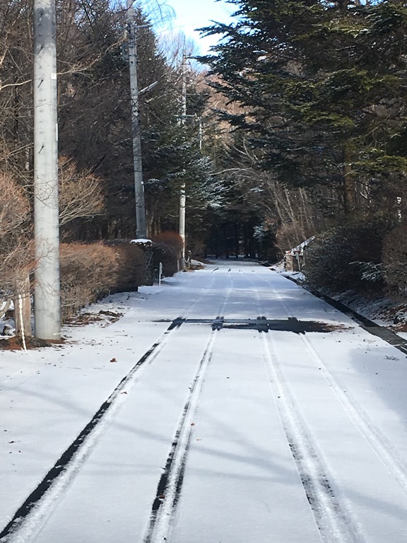 国道や車の通行量の多い道路の雪は融けていますが、別荘地内、日陰は融けきらず、路面が凍結しています。