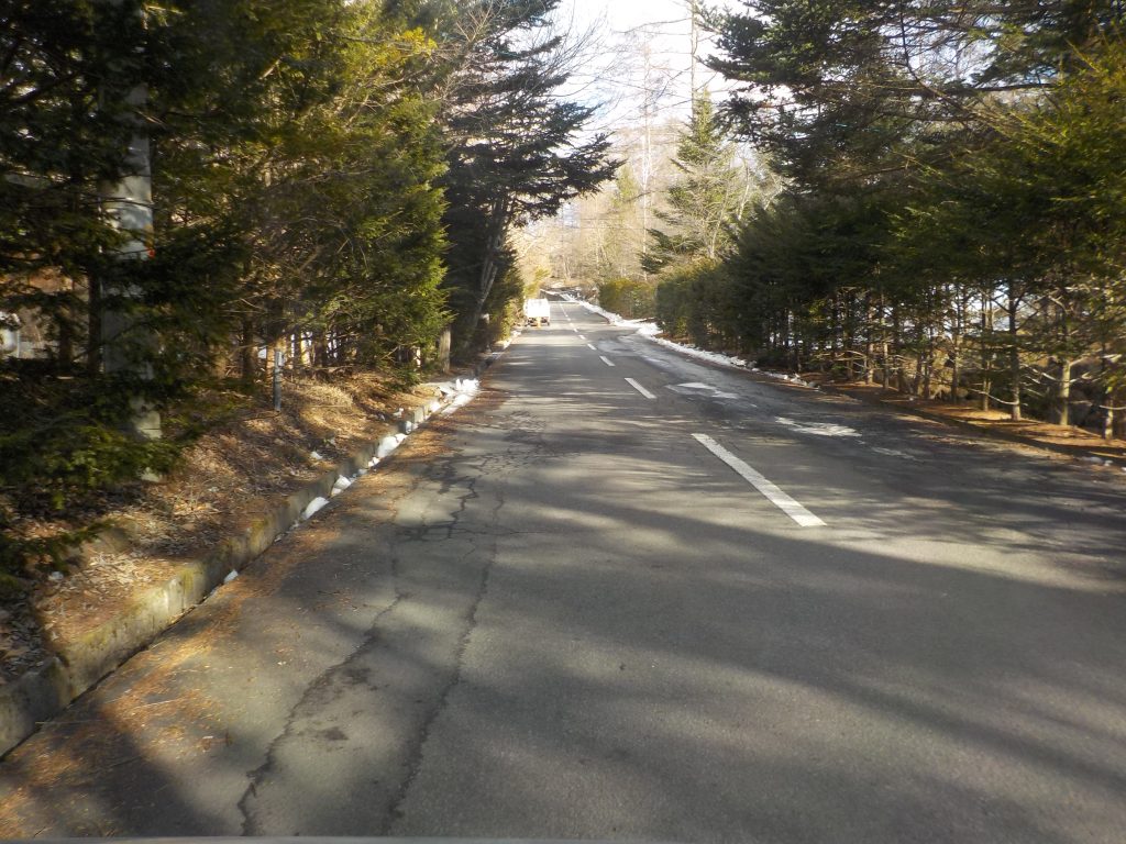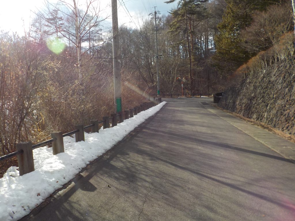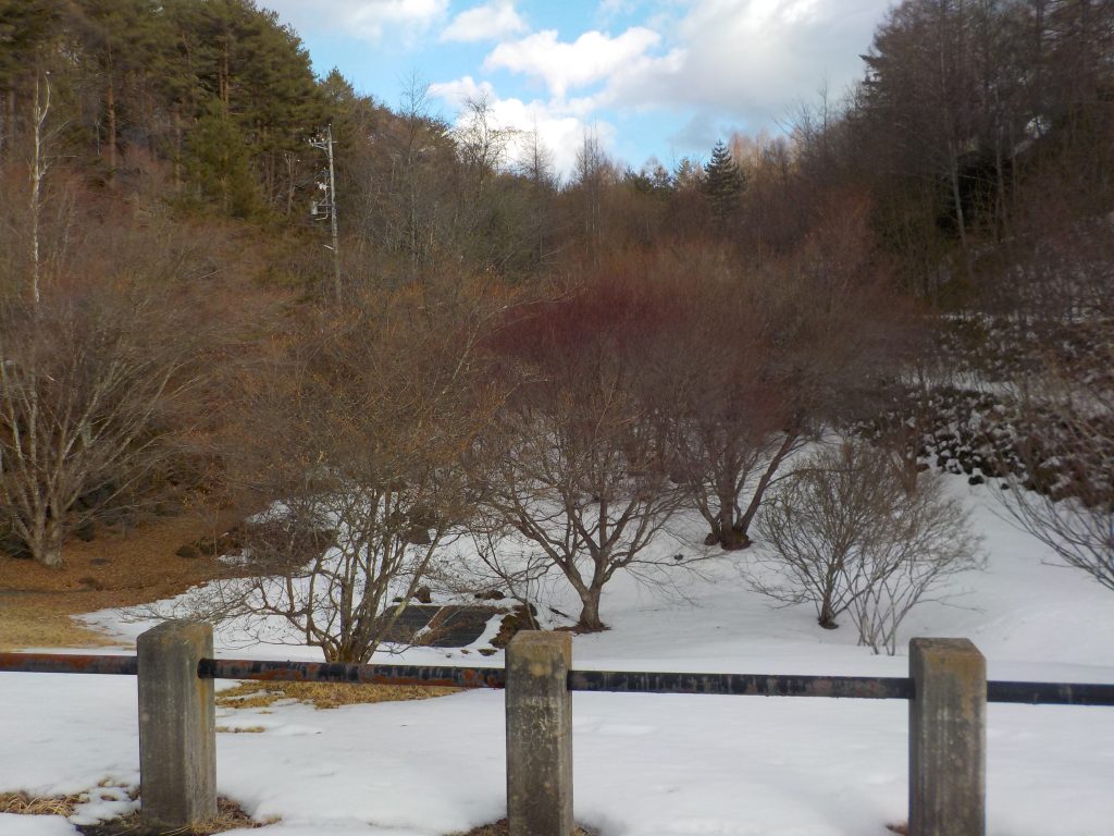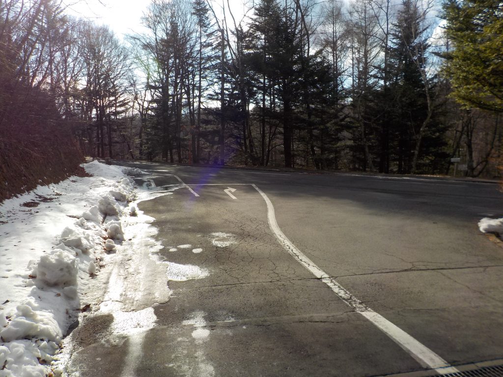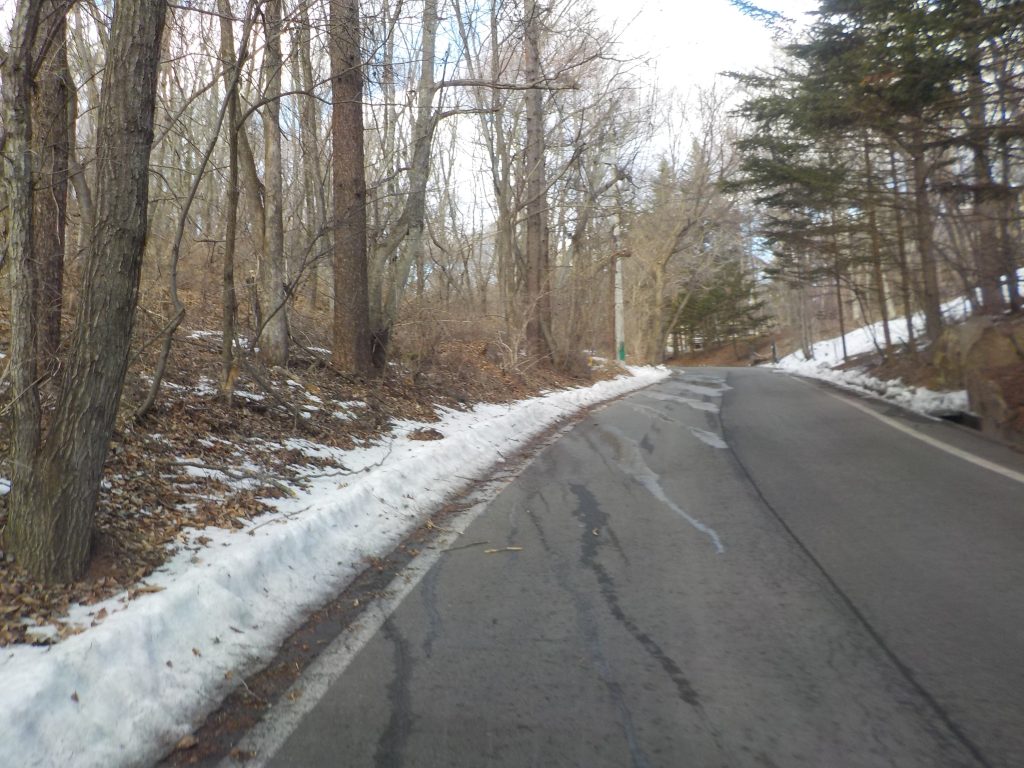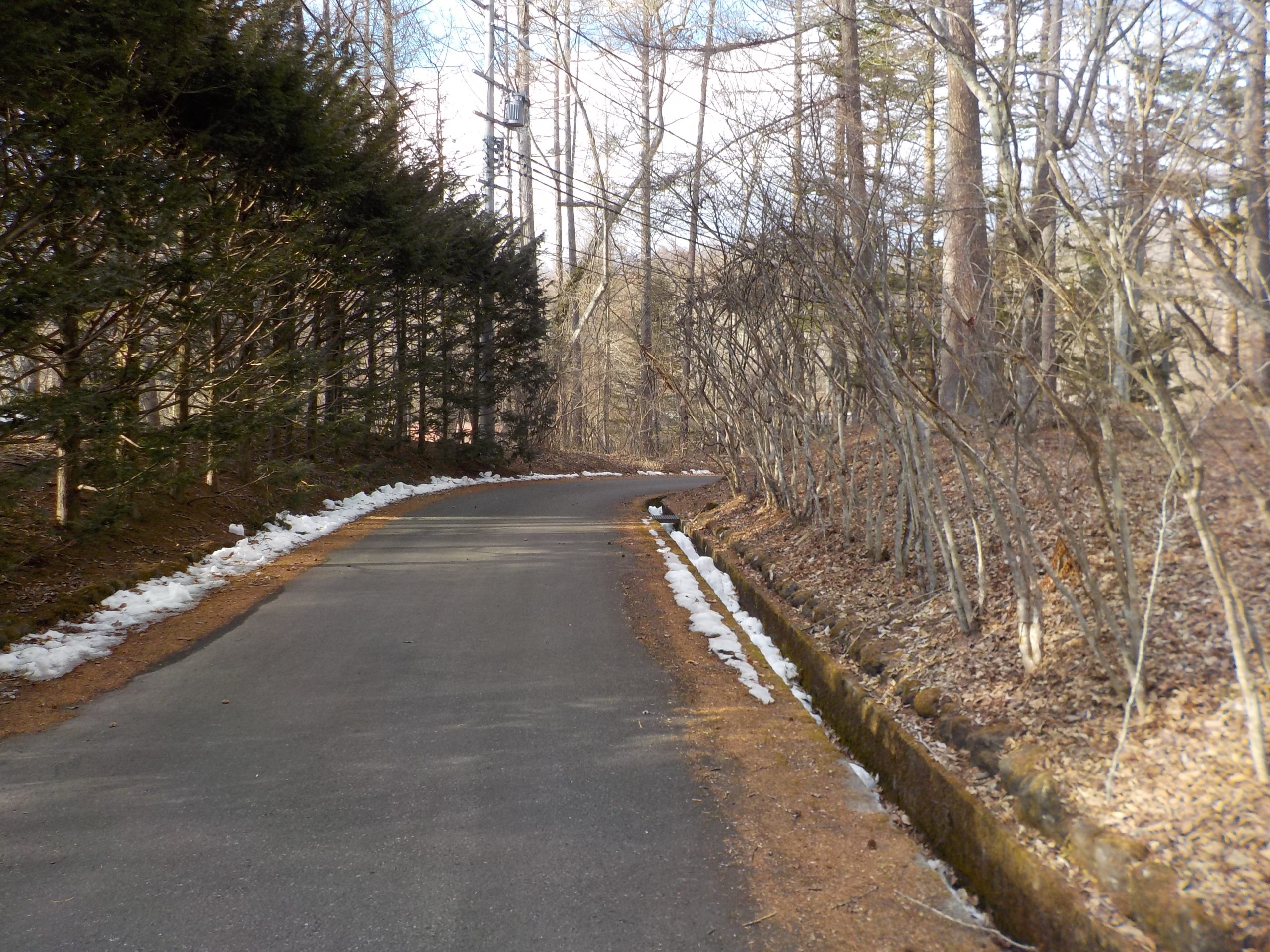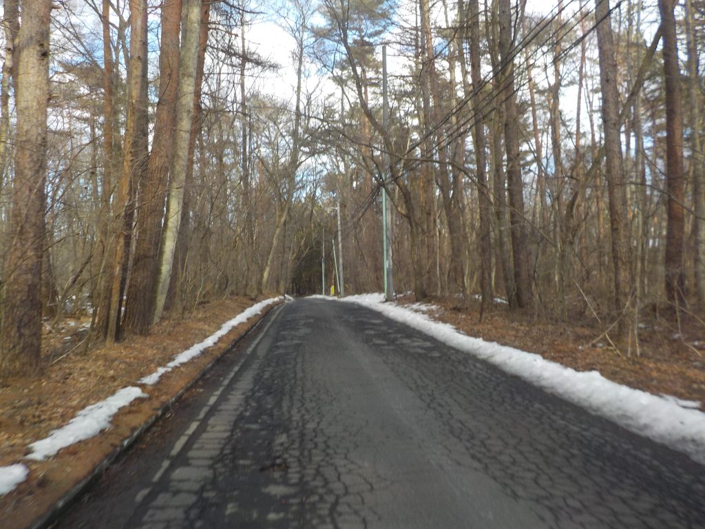 道路の雪はほとんど融けていますが、道路脇、別荘の敷地内にはまだと融けずに残っています。