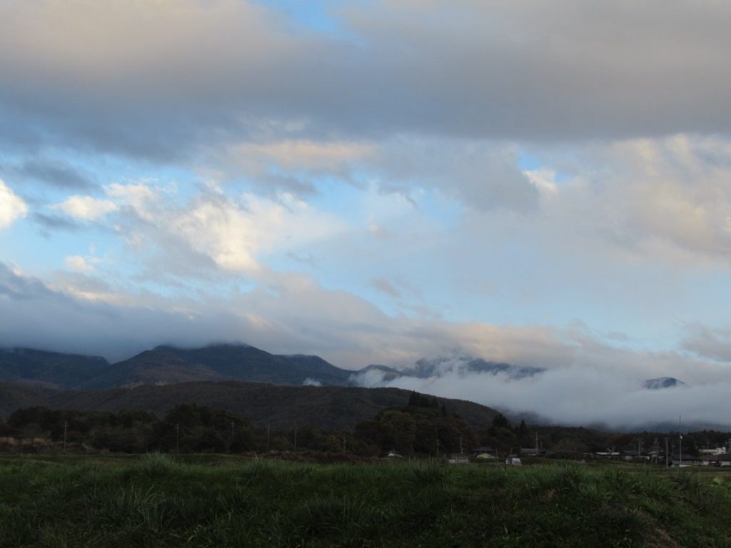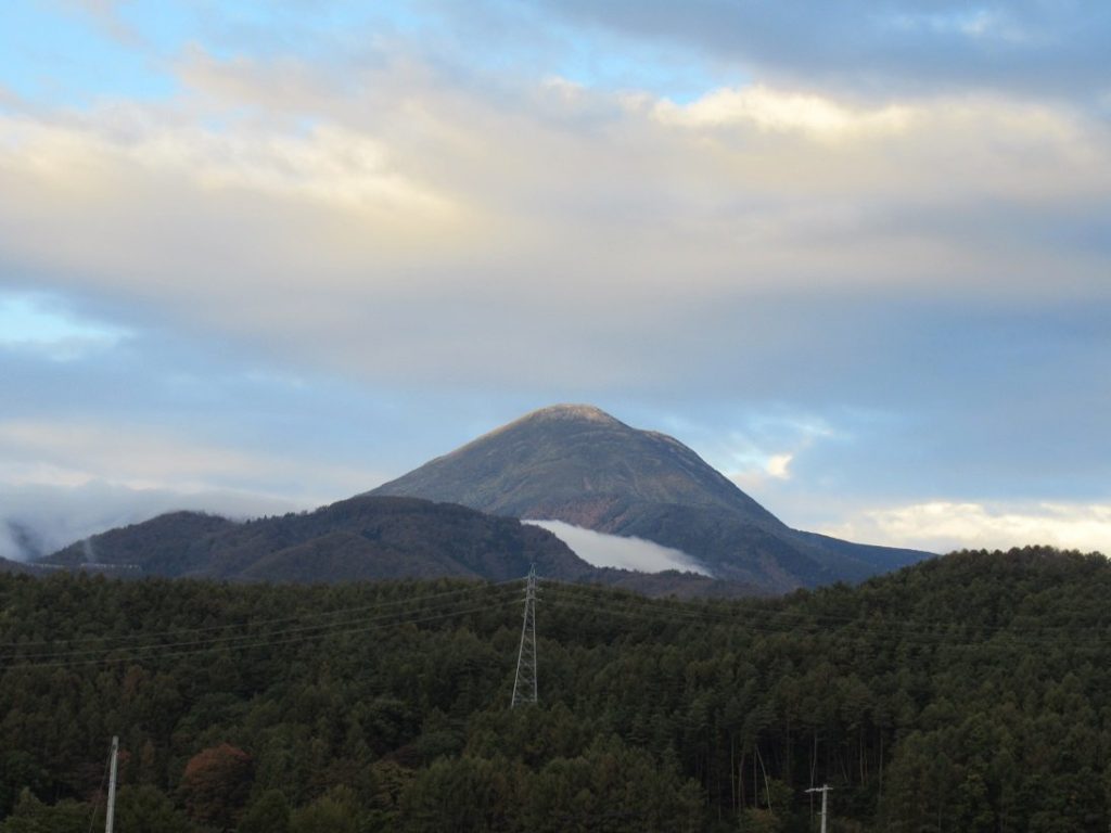 蓼科山は中腹に霧がたまり、山頂にだけ日が当たって