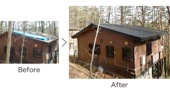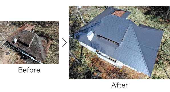 劣化し、穴が開いた屋根をガルバリウム鋼板にて重ね葺き。