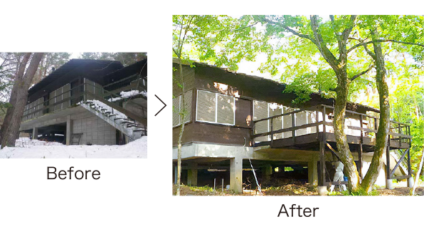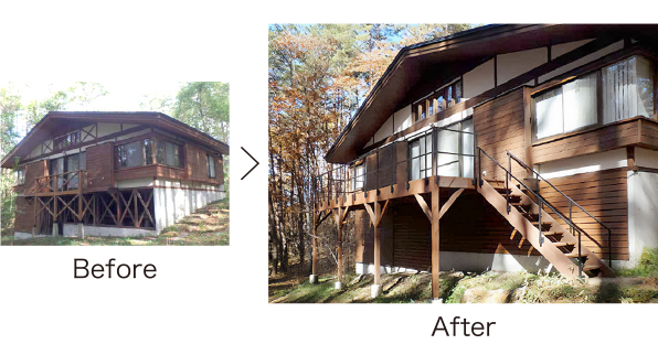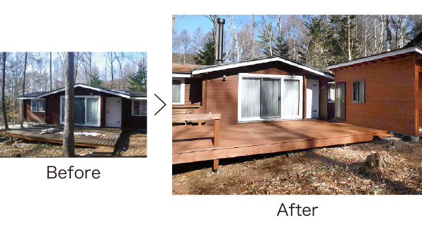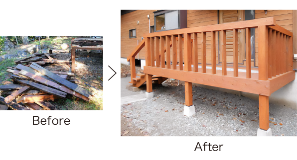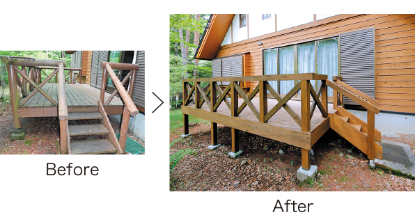 傷みが目立ちはじめた古いサンデッキを取り壊し、防腐・防蟻処理を施した木材を使用し、劣化しにくいサンデッキを施工。