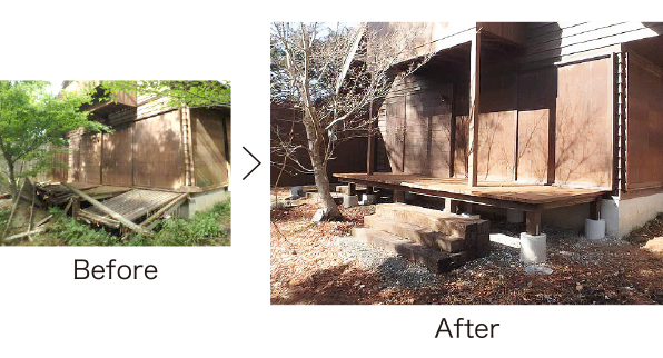 木部が朽ちていた既存のサンデッキを取り壊し、基礎石・土台・床・手摺り・階段の全てを一新。