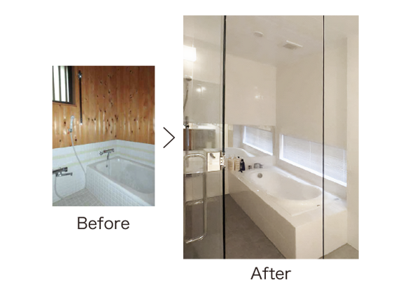 狭かった和風の浴室を、ガラス張りの広々とした洋風バスルームに変更。洗面室と一体化したシームレスな空間を実現。