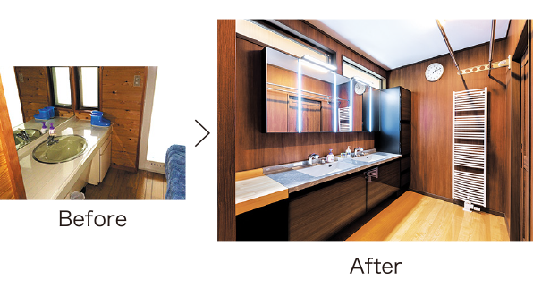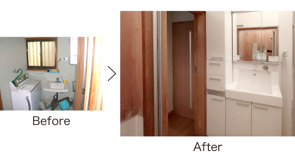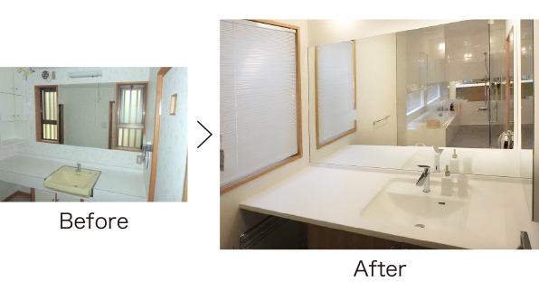顔や手を洗うだけだった洗面台を、収納スペースが豊富な洗面化粧台に交換。物が露出しない、すっきり清潔感のある洗面室に一新。