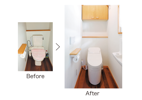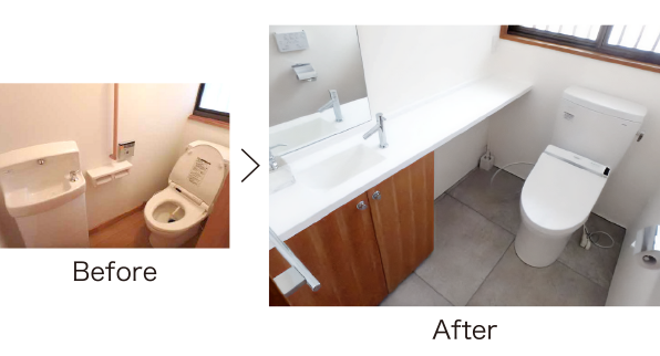 従来のトイレより小型でスタイリッシュなトイレに交換。トイレを替えるだけで空間全体をフレッシュな雰囲気に刷新。