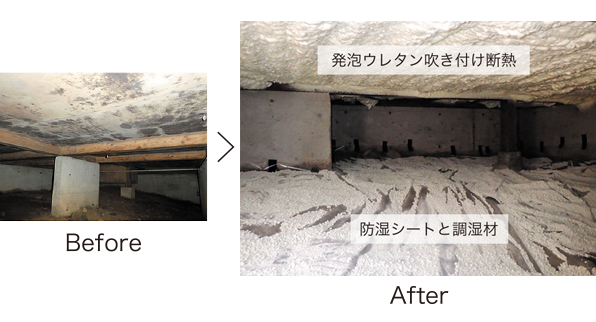 床に発泡ウレタン吹き付け断熱≠実施し、地面に防湿シートと調湿剤≠敷設。足が直接触れる床の断熱は体感的に効果大。