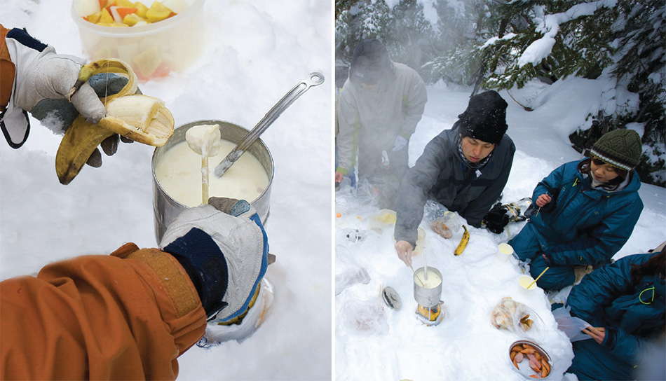 まるで絵本に出てくるような白い森の風景をさらに堪能するため、ランチを雪の中で楽しむことにした。メニューは身体をほっと温めるチーズフォンデュ。座りやすいフラットな場所を見つけ、ガスストーブを置き、アルミのコッヘル鍋をセット。予め細かく刻みこんできたチーズ・小麦粉・牛乳を鍋に入れ、強火で掻き混ぜながらチーズを溶かす。チーズの甘酸っぱいやわらかな香りが漂いはじめたら、そろそろ食べ頃。