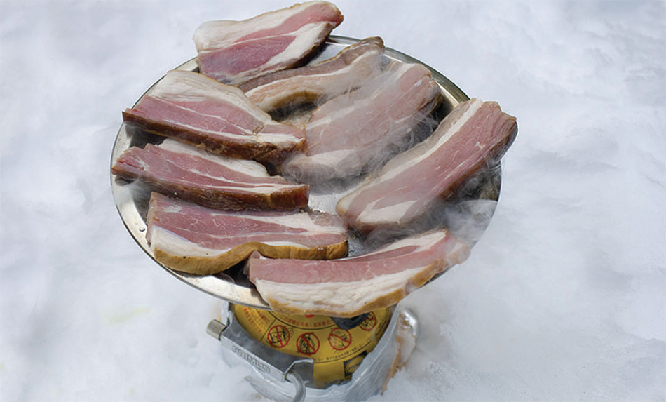 パン、ジャガイモ、バナナ、ソーセージなどなど。好みの食材を串に刺し、チーズをからめて口の中へ。まろやかで甘酸っぱいチーズの芳香が口中に広がる。チーズフォンデュは、スイスの郷土料理だけあって雪山がとてもよく似合う。料理の締めくくりはワイルドな厚切りベーコン。ほとばしる肉汁が食欲をさらにそそる。