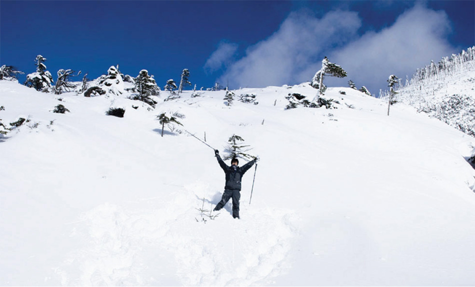 スノーシューは日本のカンジキのようなもので、登山靴に装着するだけで土の上を普通に歩いている感覚で雪上を歩き回ることができる。フワフワの深雪の上をパフッパフッと軽やかに歩く心地よさ、なんだか歩いているだけでウキウキしてくる。今シーズンは雪に恵まれ坪庭周辺も抜群のコンディション。雪質もサラサラのパウダースノーなので軽くてとても歩きやすい。これなら足も疲れにくそうだ。