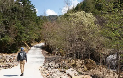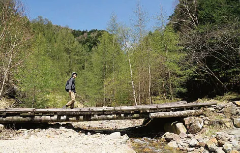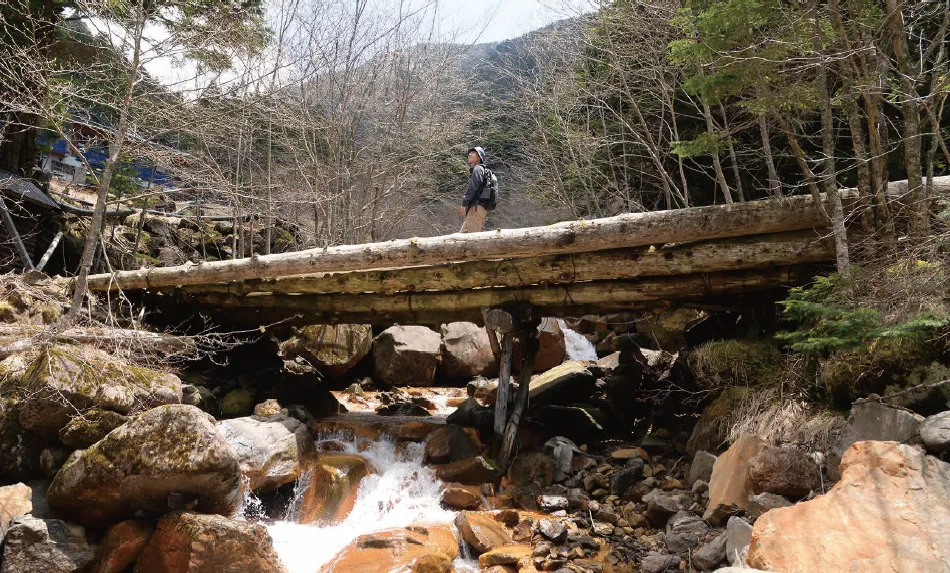 泉野方面からの旧街道と合流すると目的地の「夏沢鉱泉」まで、あとわずか。豪快な沢音を響かせる鳴岩川源流に掛かる丸太橋を渡ると、シラビソの原生林に包まれた「夏沢鉱泉」が現れる。電力の100%を水力発電と太陽光発電で賄うエコでクリーンな鉱泉宿だ。桜平ゲートからゆっくり歩いて30分ほどで到着した。
