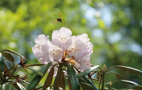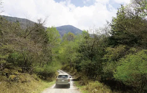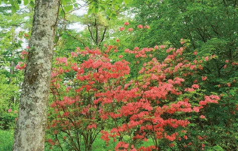 標高約1,090mの「しらかば平」から標高約1,510mの「りんどうが丘」まで、メインストリートの左右に7つの街区が広がる『蓼科高原三井の森』。道を進んで行くと街区によって芽吹きや開花状況が異なり、季節の移ろいを実感できる。沿道を彩るレンゲツツジやシャクナゲなど初夏の花々を楽しみつつ別荘地内を走り抜けると、「硫黄岳」登山口方面と「天狗岳」登山口方面への分岐点に出る。