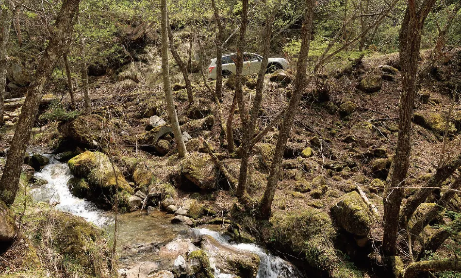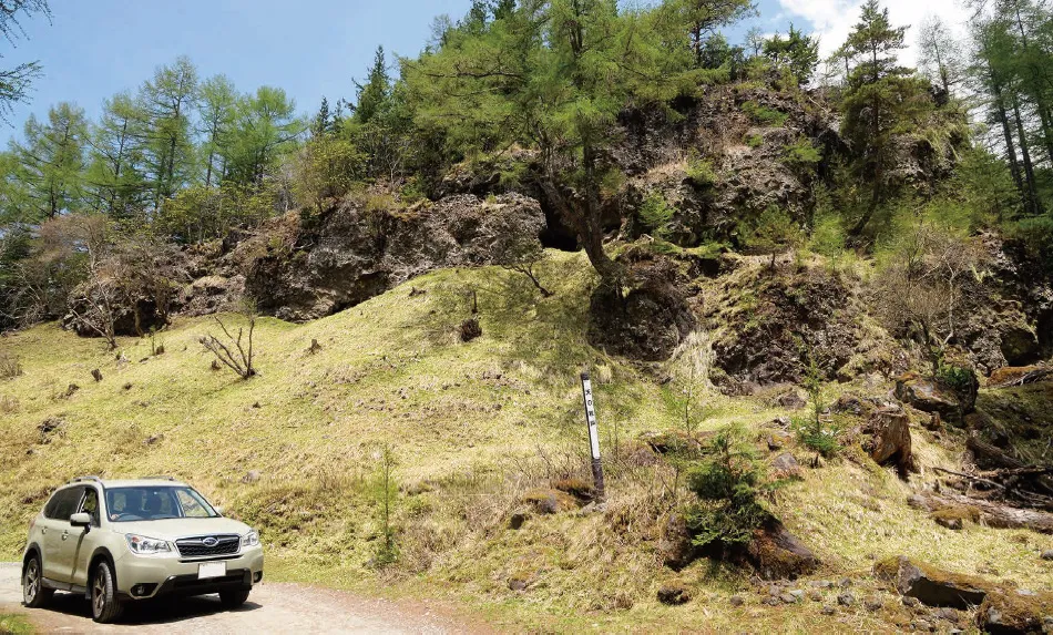普段アスファルトの上しか走っていない街の人間にとって未舗装というだけでもワイルドだが、八ヶ岳の懐深いダート道は、沢沿い、山腹のトラバース、樹のトンネルなど野趣たっぷり。酒徳利を首に下げた「狸岩」や巨岩が連なる「天の岩戸」などの見所も点在しており、車窓の風景も変化に富んでいる。