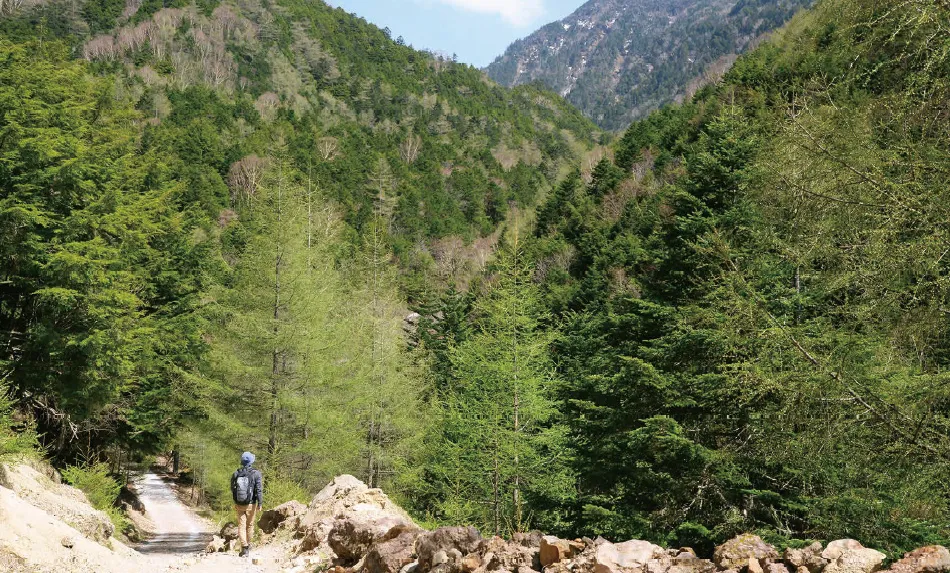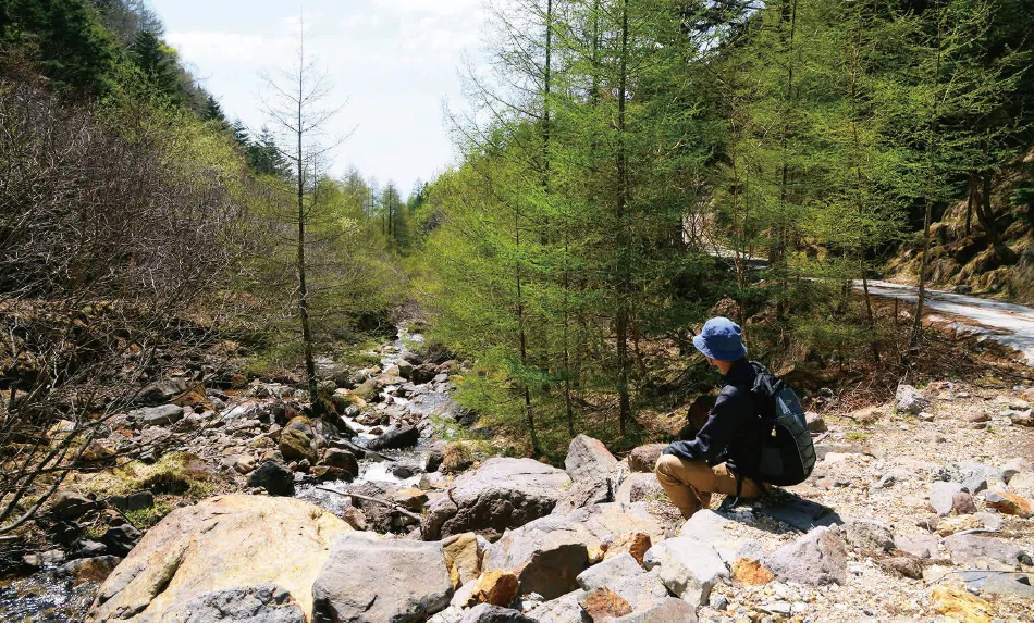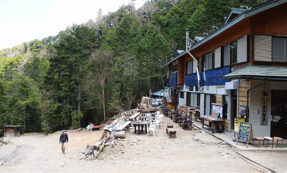 森が芽吹き、清々しい緑風がそよぐ登山道を上り、秘境ムード漂う標高2,060mの夏沢鉱泉へ向かった。