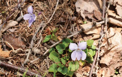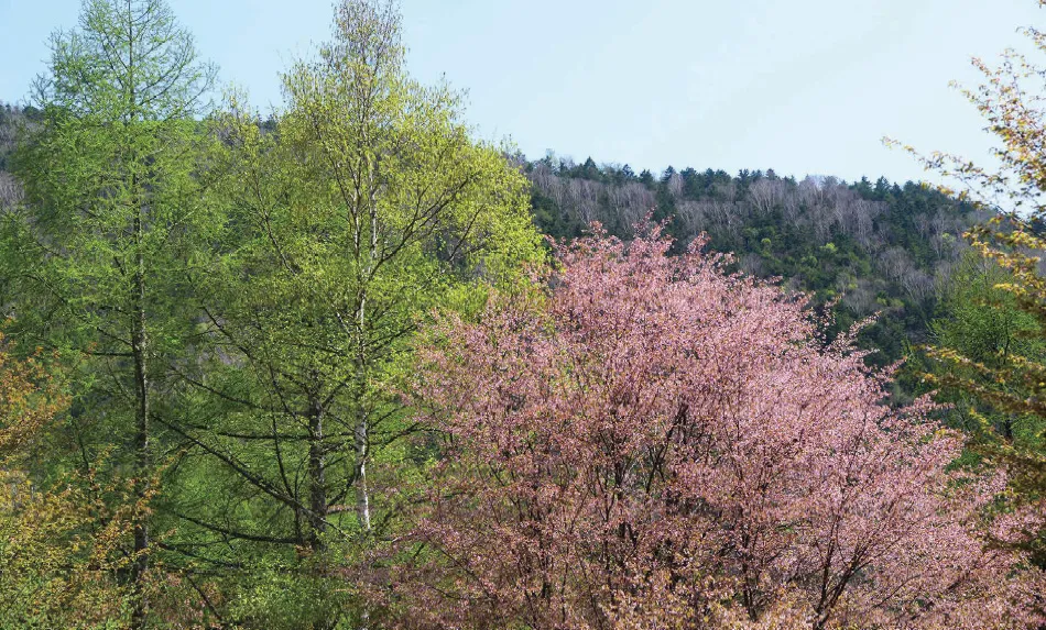 満開のヤマザクラ、芽吹きはじめたばかりのダケカンバ…、周りの新緑は別荘地内より一足遅く、初夏というよりも春の装い。標高が上がるにつれ、芽吹き前の木々が目立ちはじめる。
