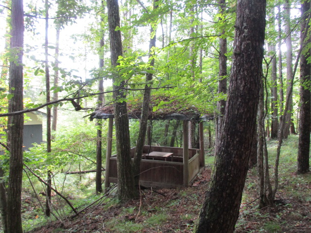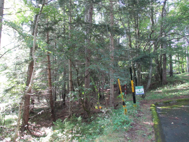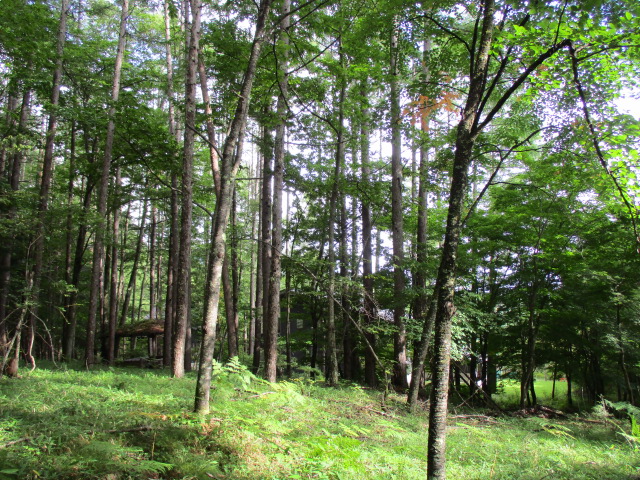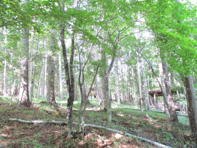 カラマツと雑木林に囲まれた南緩傾斜の広い敷地。※敷地内に「東屋」が建っています。